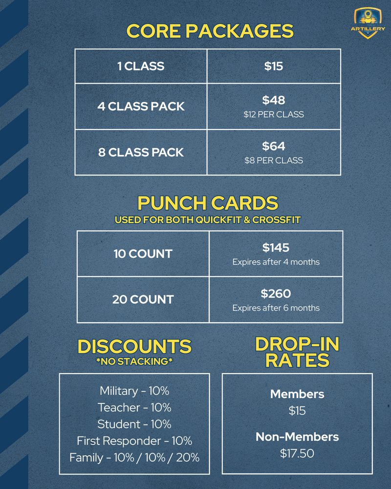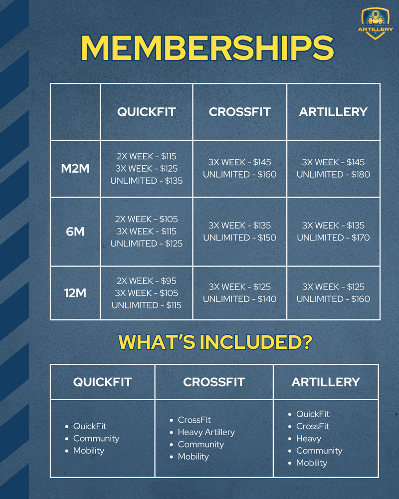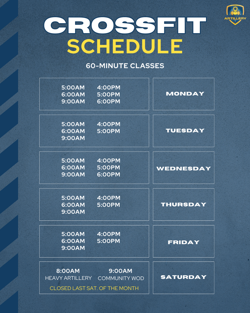 Heavy Artillery is a 60-minute class that combines heavy lifting with high-intensity conditioning to test both your physical and mental limits. You’ll build raw strength while improving endurance through challenging, grit-driven workouts. This class is designed to help you turn weaknesses into strengths—one rep at a time. Included in all CrossFit memberships.