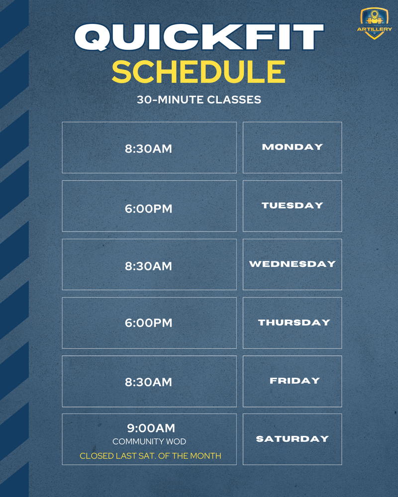 QuickFit is a fast-paced, 30-minute sweat session focused on cardio, core and functional movement using bodyweight and light equipment. It’s designed to burn calories, build lean muscle, and fit into even the busiest schedule—no barbells, no complicated movements, just non-stop energy.